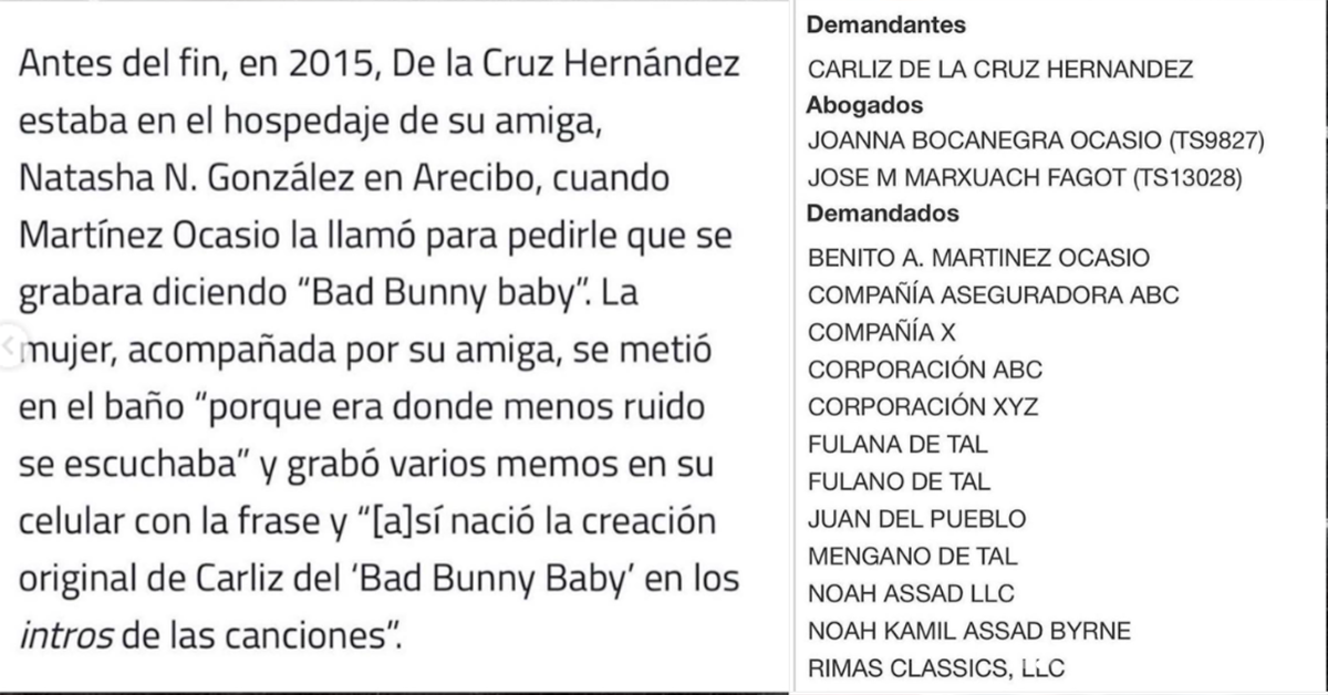 La d3m4nda fue establecida en base a Derechos de aut0r, Dañ0s y perju1ci0s, Derechos de imagen, Expl0taci0n comercial de su voz y frase «Bad Bunny Baby».El d1sgust0 de la ex de Benito, surgió debido a que no se establecio un acuerdo directo con ella para la utilización de su frase y voz, siendo utilizada en giras, promociones, conciertos a nivel mundial, Televisión, radio, medios digitales, las diferentes plataformas, tanto digitales y sociales, entre otras.