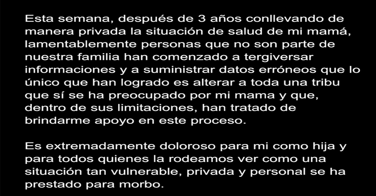 En ese mismo orden, la joven dejó en claro que su comunicado de prensa será único en relación al tema que concierne a su madre.