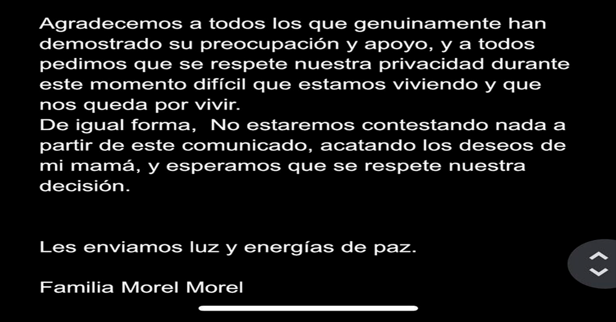 En relación a todo lo que ha surgido en la familia Morel, su hija Isabel realizó un comunicado de prensa, dando algunos detalles de lo que sucede con su madre.Dentro de las explicaciones, Isabel solicitó a todos los medios, un poco de privacidad y respeto para la familia, ya que están atravesando por una situación muy difícil emocionalmente.