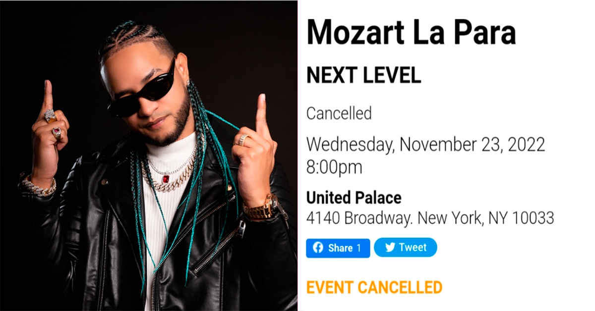Santo Domingo, R.D.- Sin ningún tipo de detalles, fue canc3lada la presentación del urbano dominicano Mozart La Para en el United Palace, de dicha ciudad, pautado para el próximo 23 de noviembre de 2022.